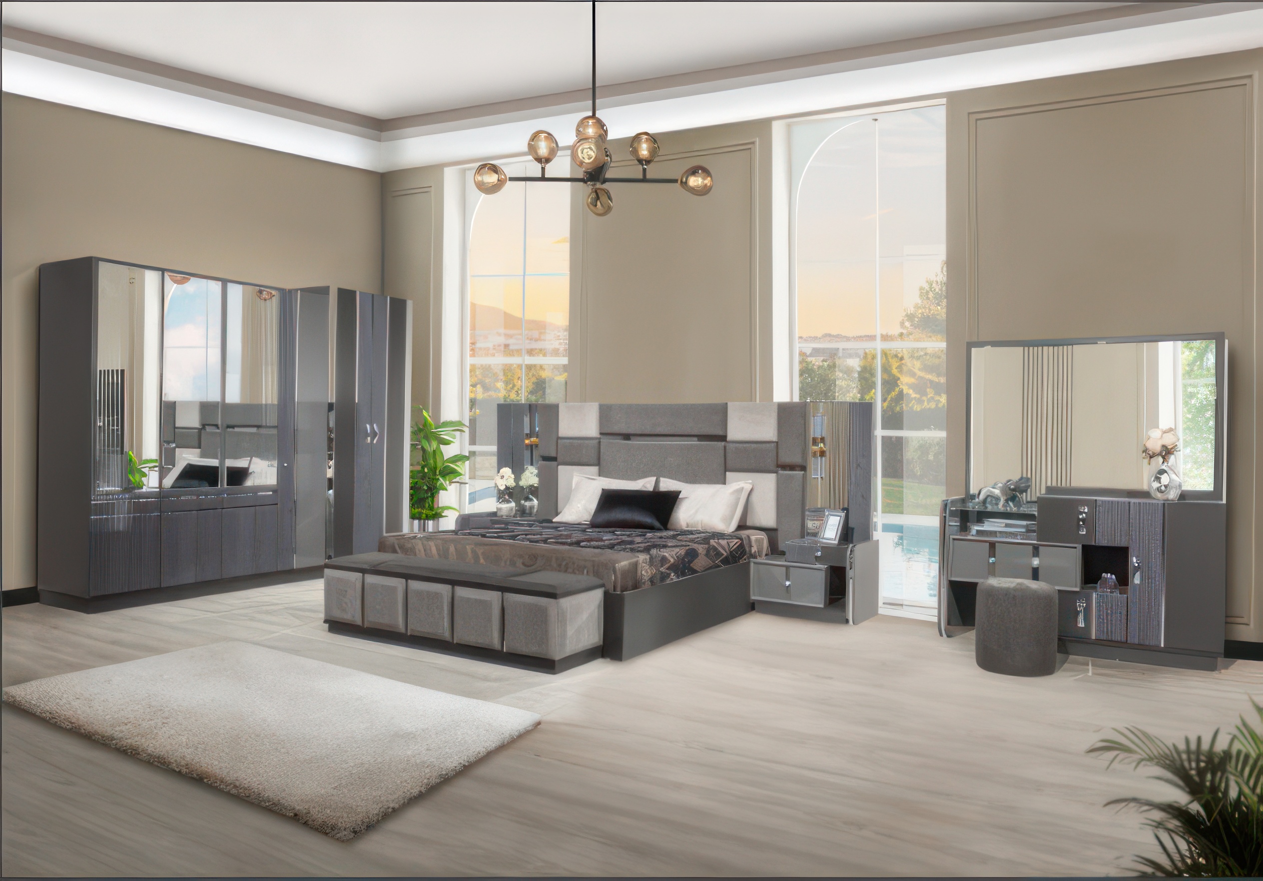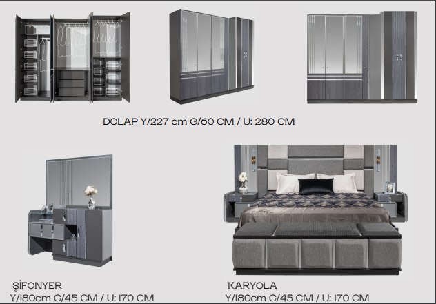 Monalısa Yatak Odası, lüksün ve zarafetin simgesidir. Antrasit ve gümüş renklerin mükemmel uyumuyla tasarlanmış bu oda, modern bir şıklık sunuyor. Antrasit renginin derinliği ve gümüşün parıltısı, odanın atmosferini zenginleştirir ve göz alıcı bir etki yaratır. Monalısa Yatak Odası, rahatlığı ve estetikliği bir araya getirerek, evinize benzersiz bir dokunuş katar.