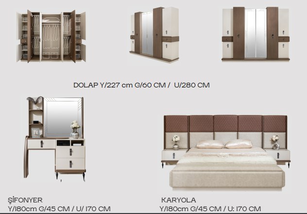Modern Yakamoz Yatak Odası, modern yaşam tarzını yansıtan ve şıklığıyla göz kamaştıran bir seçenektir. İki farklı renk seçeneğiyle ve işlevsel detayıyla yaşam alanınızı güzelleştirmek için mükemmel bir tercihtir.